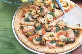 pizza, prawn. calamari, onion, capsicum, cheese, tomato sauce