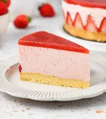 A light strawberry mousse cake made of sponge cake, strawberry ganache, strawberry mousse, and topped with a layer of strawberry jelly.